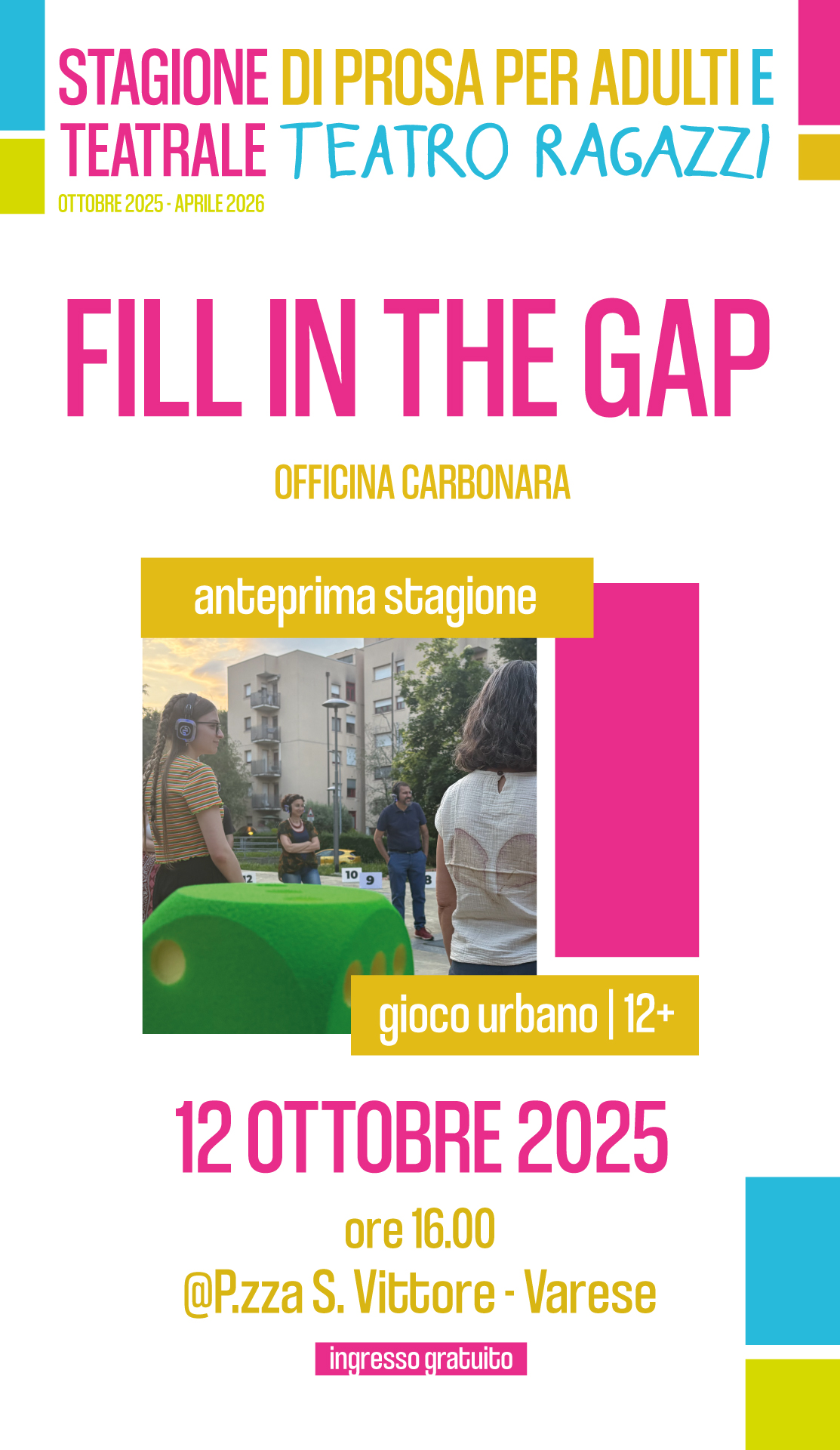 In Fill in the GAP una piazza urbana si trasforma in un grande gioco da tavolo, con caselle su cui si può sostare in compagnia, con una regia live e una colonna sonora originale, e con tiri di dado che diventano un’impresa collettiva: un’esperienza ludica e immersiva che – tramite la tecnologia delle radiocuffie wireless usata a fini creativi – attraversa il mondo delle azzardopatie, colmando il gap tra una percezione comune che le colloca lontane dalla vista, ristrette a soggetti isolati e patologici, e una realtà per cui il fenomeno è esteso, vicino e urgente.