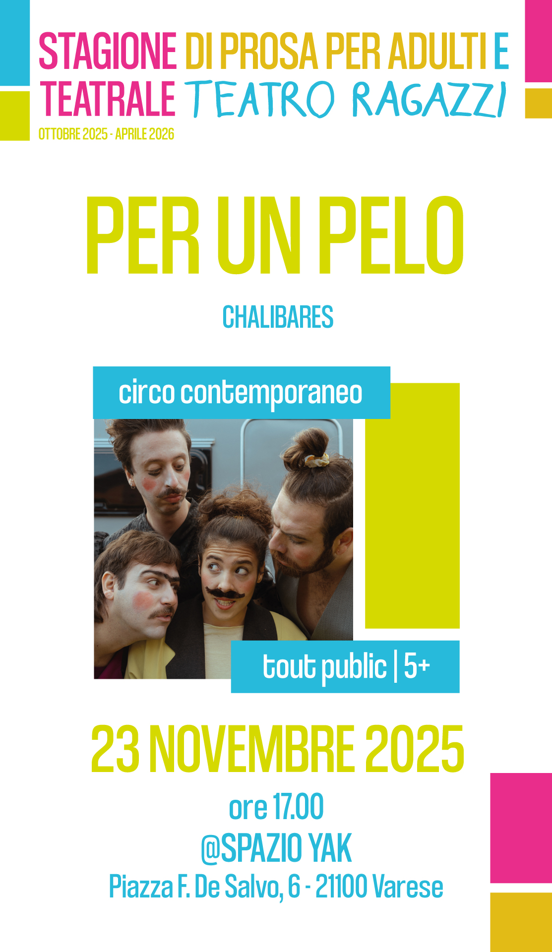 “Per un pelo” nasce dall’incontro tra due artisti di circo e due clowns musicisti, e dal desiderio di creare uno spettacolo in cui la musica supporti la performance circense, dando vita ad un mondo immaginifico di figure acrobatiche e virtuosismi sonori, di manipolazioni di oggetti e di sperimentazione armonica.