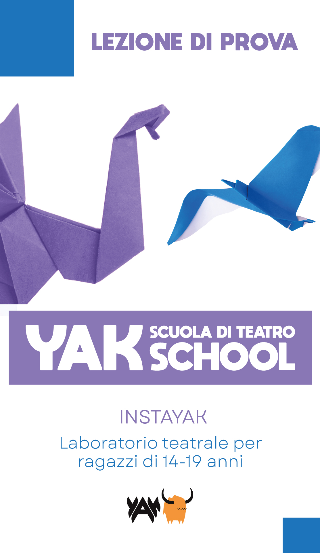 Il corso adolescenti della YAK SCHOOL si rivolge sia a coloro che si avvicinano al teatro per la prima volta, sia a chi ha già sperimentato un percorso teatrale e vuole confrontarsi con un nuovo gruppo o un nuovo approccio: da un lato si impareranno le regole del teatro, dall’ascolto allo stare in scena, all’utilizzo del corpo e della voce; dall’altro gli allievi faranno emergere le loro emozioni, la loro visione del mondo, la forza e le fragilità degli adolescenti di oggi, e infine, troveremo le parole giuste per raccontare questo mondo anche agli adulti.